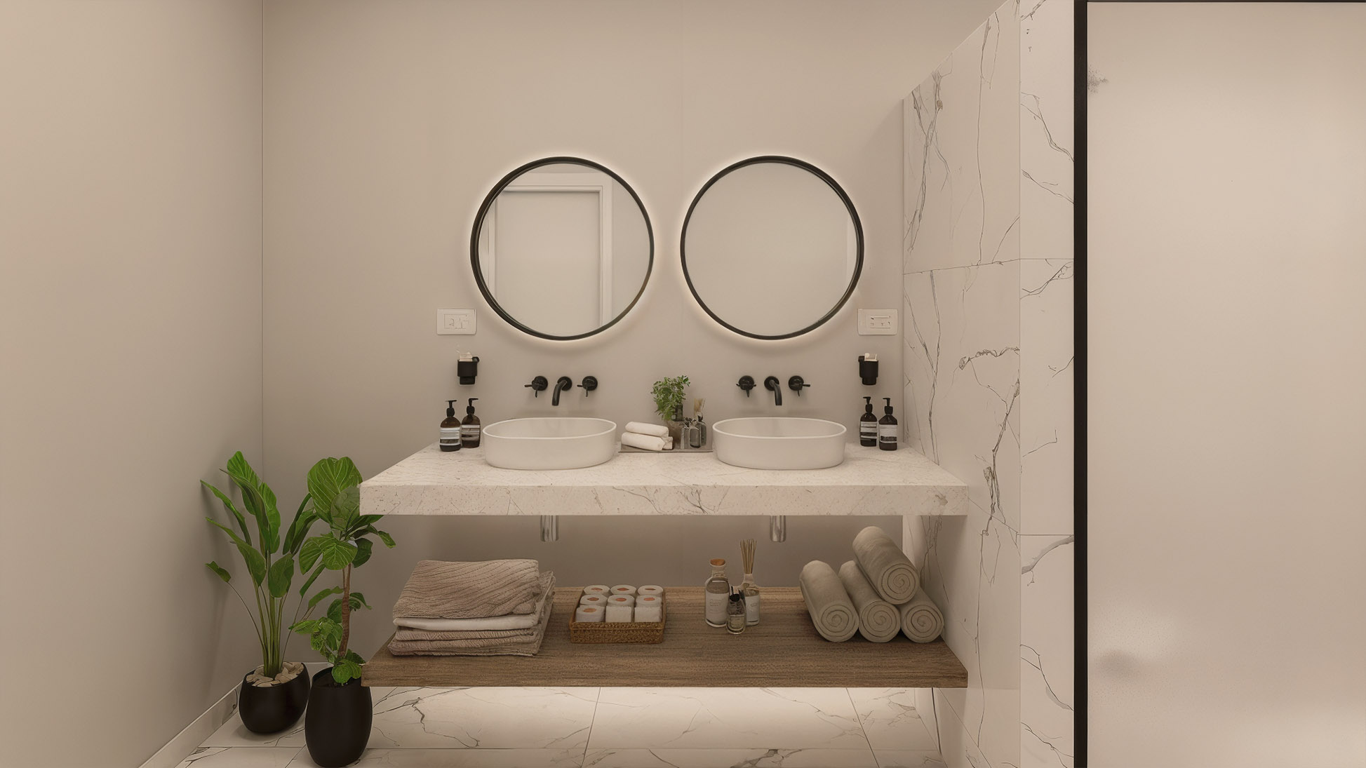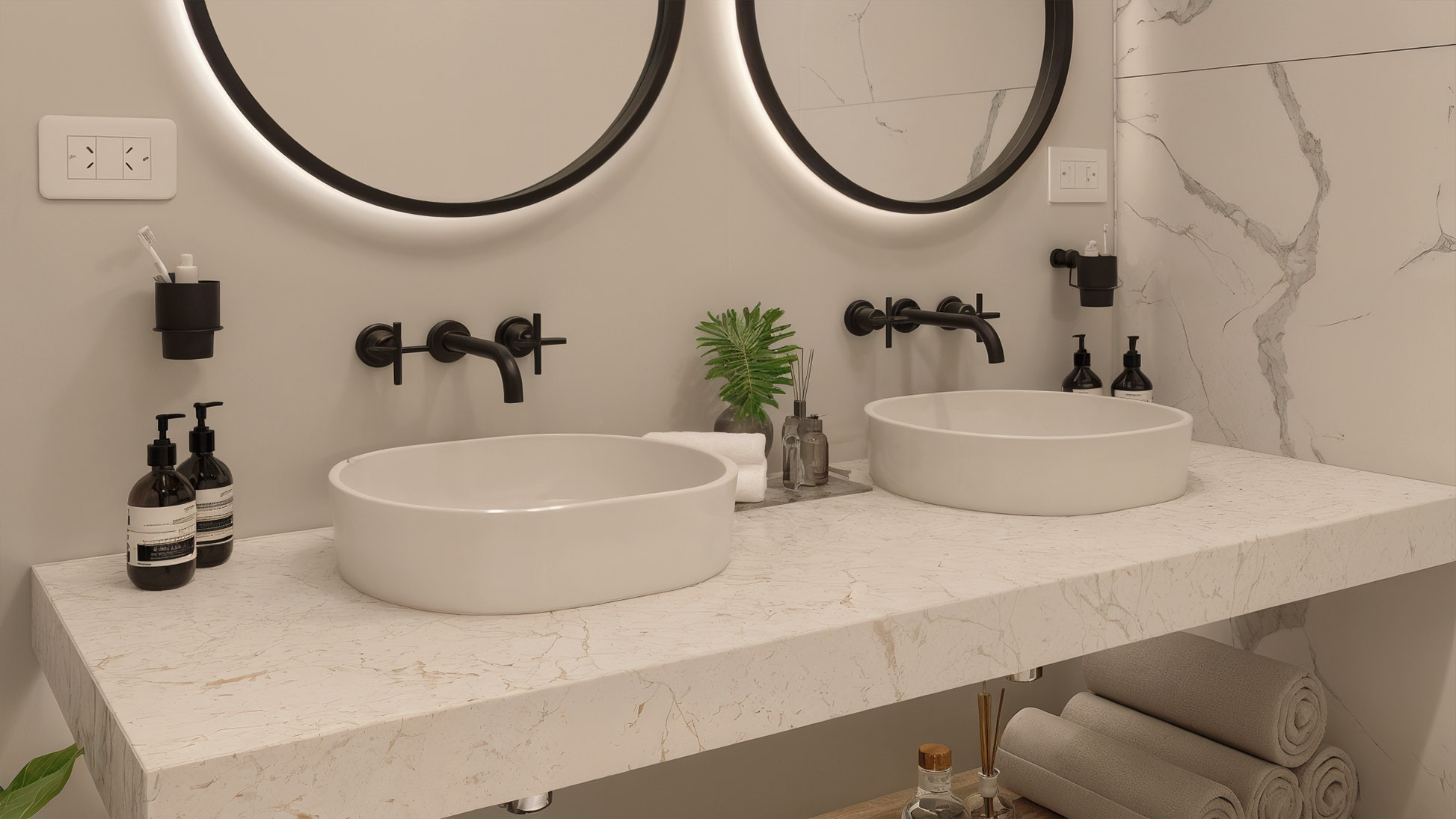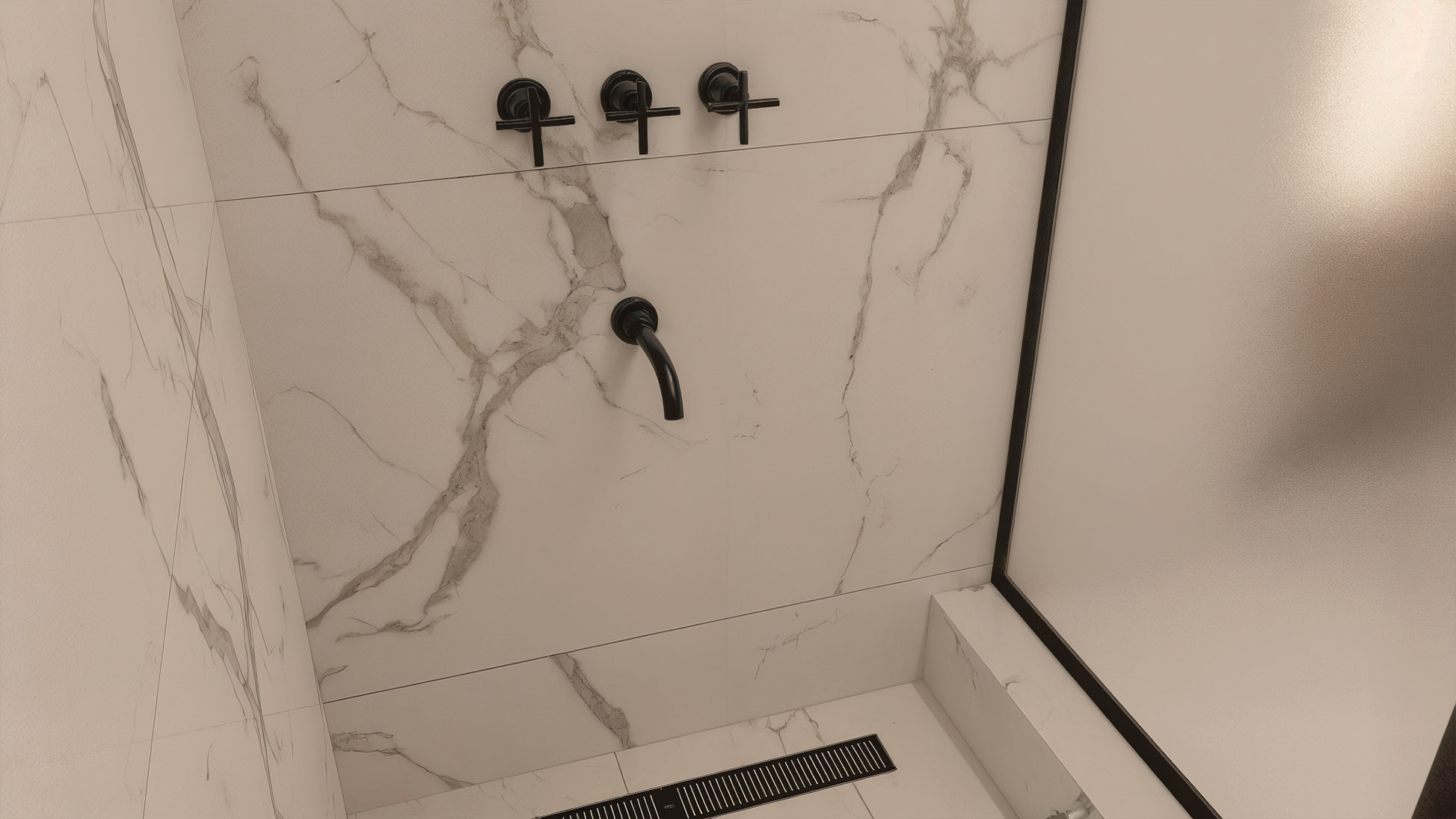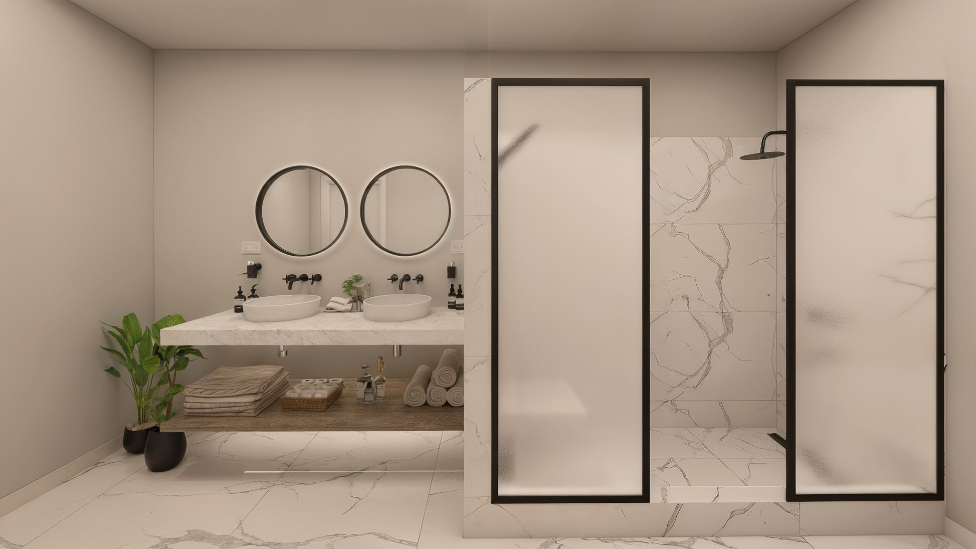 Este baño fue diseñado como un refugio cotidiano, donde la calidez de los porcelanatos marmolados, la luz tenue y los materiales nobles crean una atmósfera serena. La ducha tradicional combinada con ducha escocesa transforma el baño en un ritual sensorial, mientras que la bacha voladiza doble aporta liviandad y funcionalidad. Todo el espacio busca equilibrio y sutileza, priorizando la experiencia antes que el impacto visual, para ofrecer un lugar que no solo se vea bien, sino que se sienta bien.