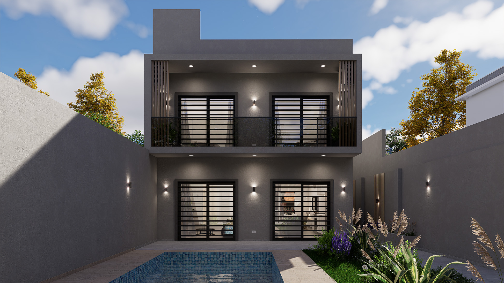 Hacia el fondo del terreno, el proyecto se abre al jardín con la piscina como punto central, acompañada por una parrilla y una pérgola semicubierta pensada para el encuentro y el descanso. Un corredor lateral permite acceder directamente al exterior sin atravesar la vivienda.