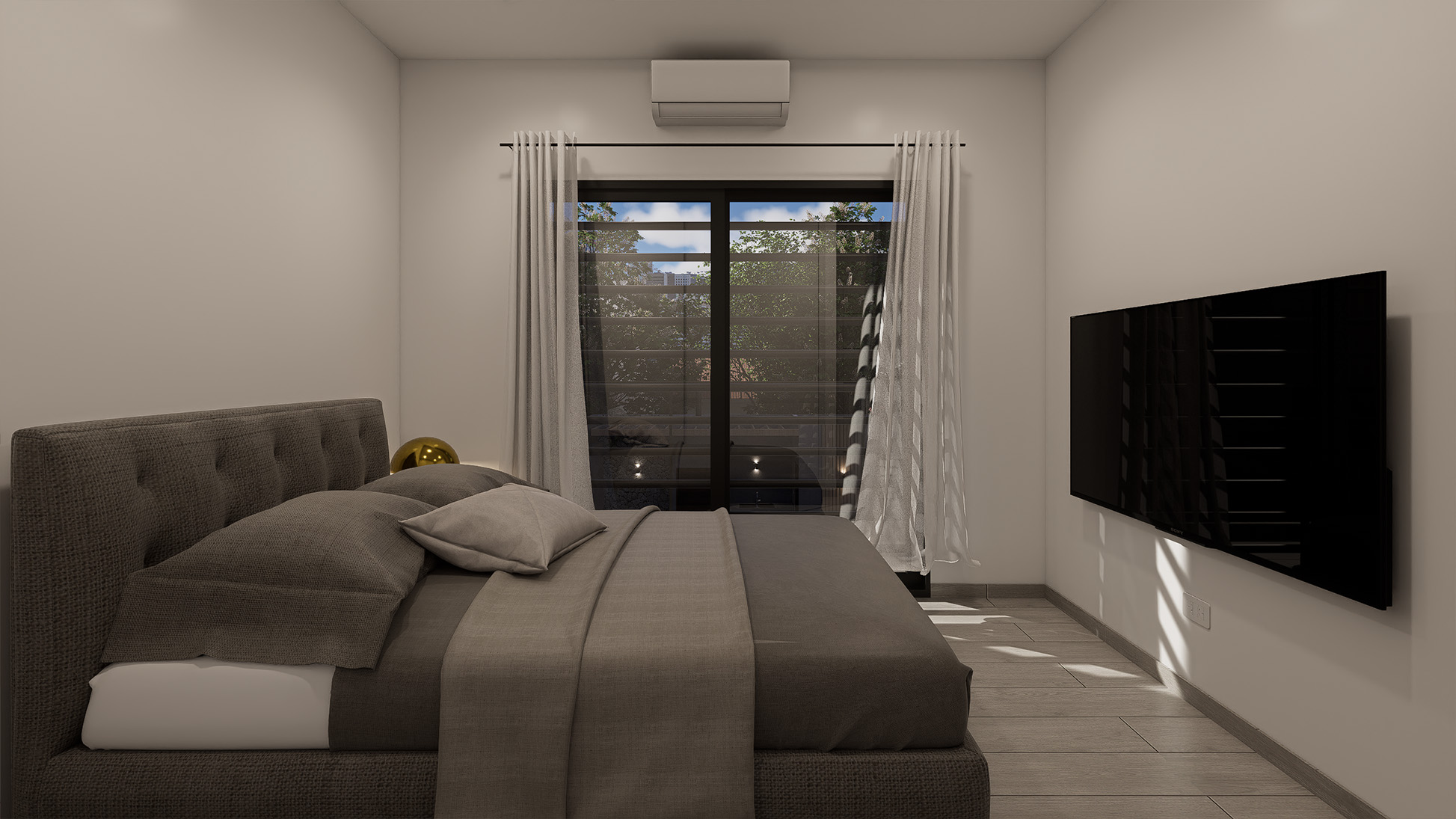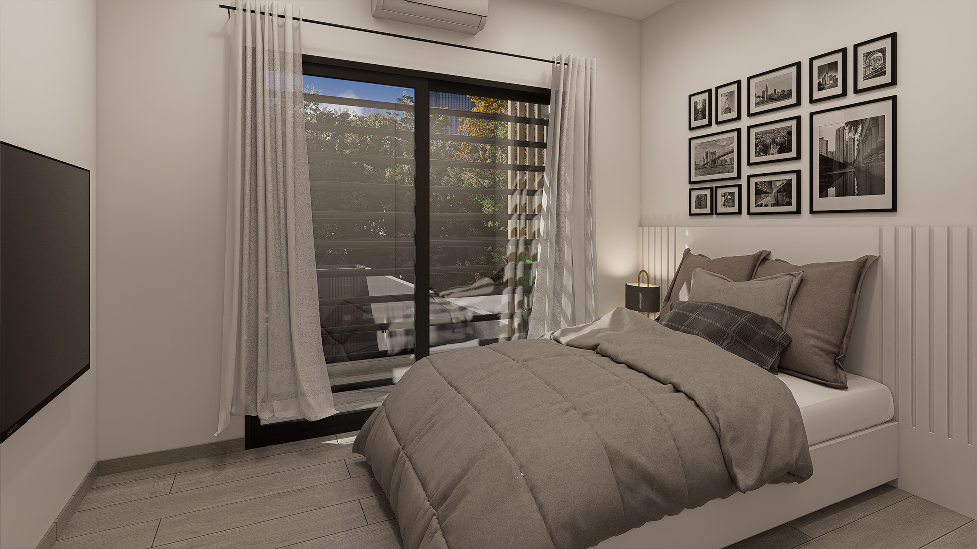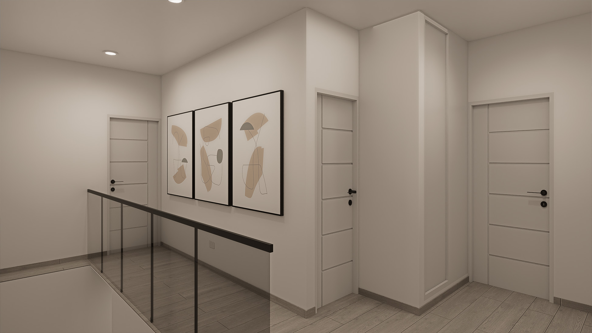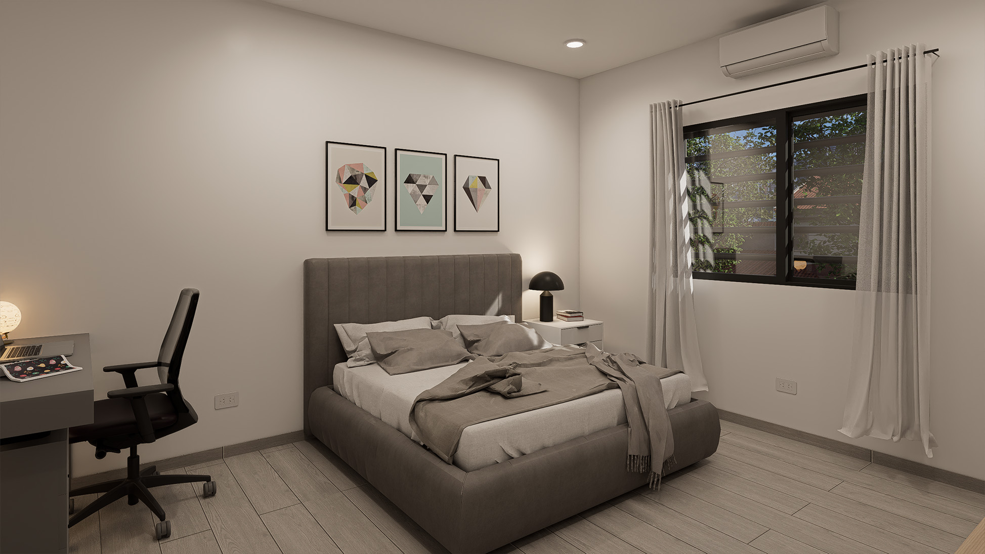 En planta alta se desarrollan cuatro habitaciones con balconeo, organizadas alrededor de un baño común que resuelve el uso privado de la planta.