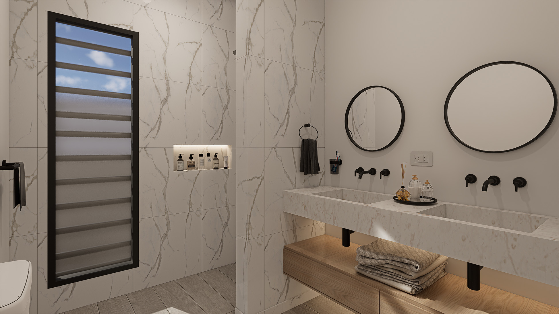 En planta baja, el corazón de la vivienda es un baño completo ubicado estratégicamente como núcleo de servicio. Este volumen central permite optimizar los espacios e incorporar una despensa oculta bajo la escalera.