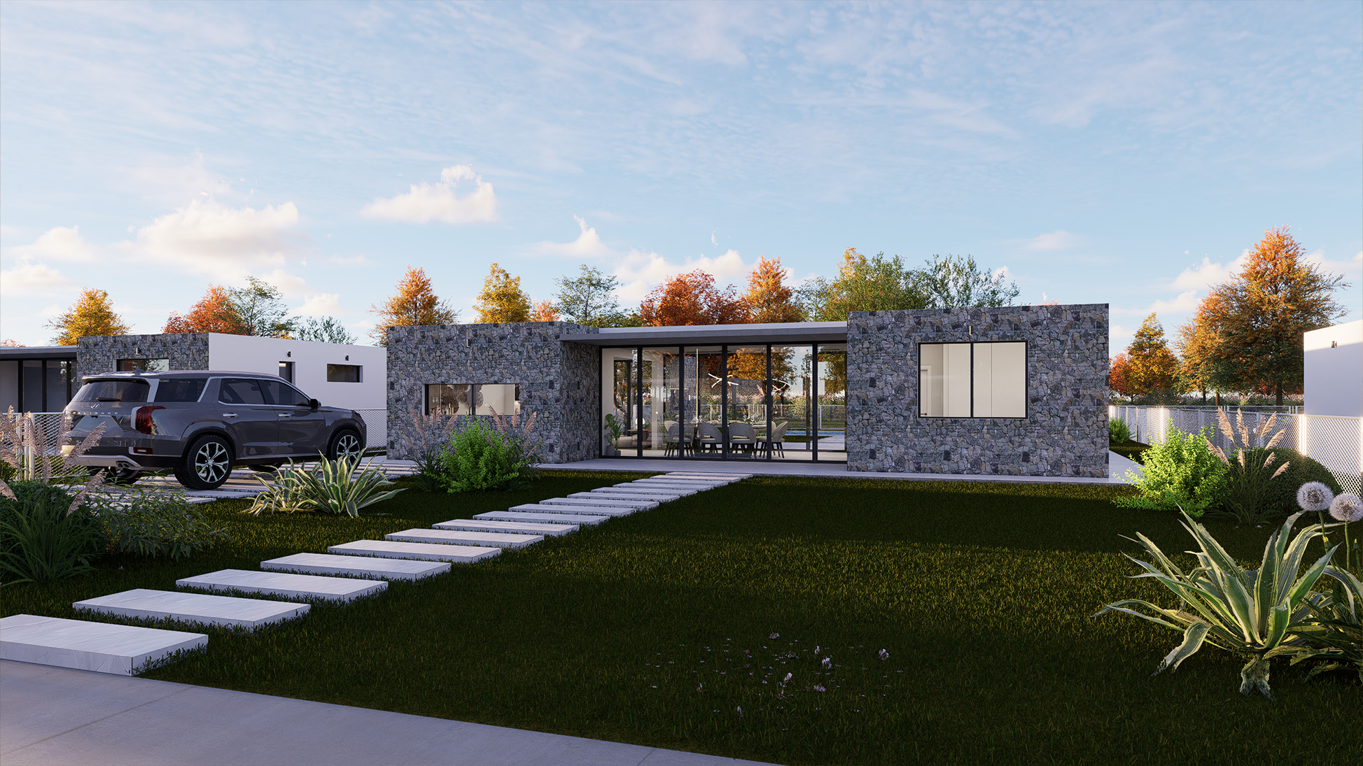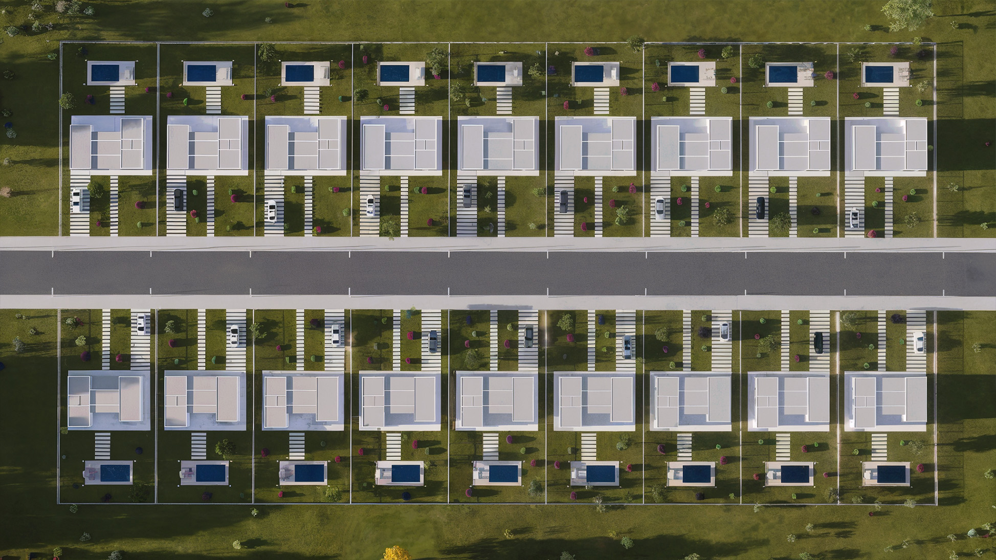 Desarrollo residencial compuesto por 18 viviendas prototipo distribuidas en el barrio Santa Anita, Cañuelas, concebido bajo un concepto de minimalismo cálido.