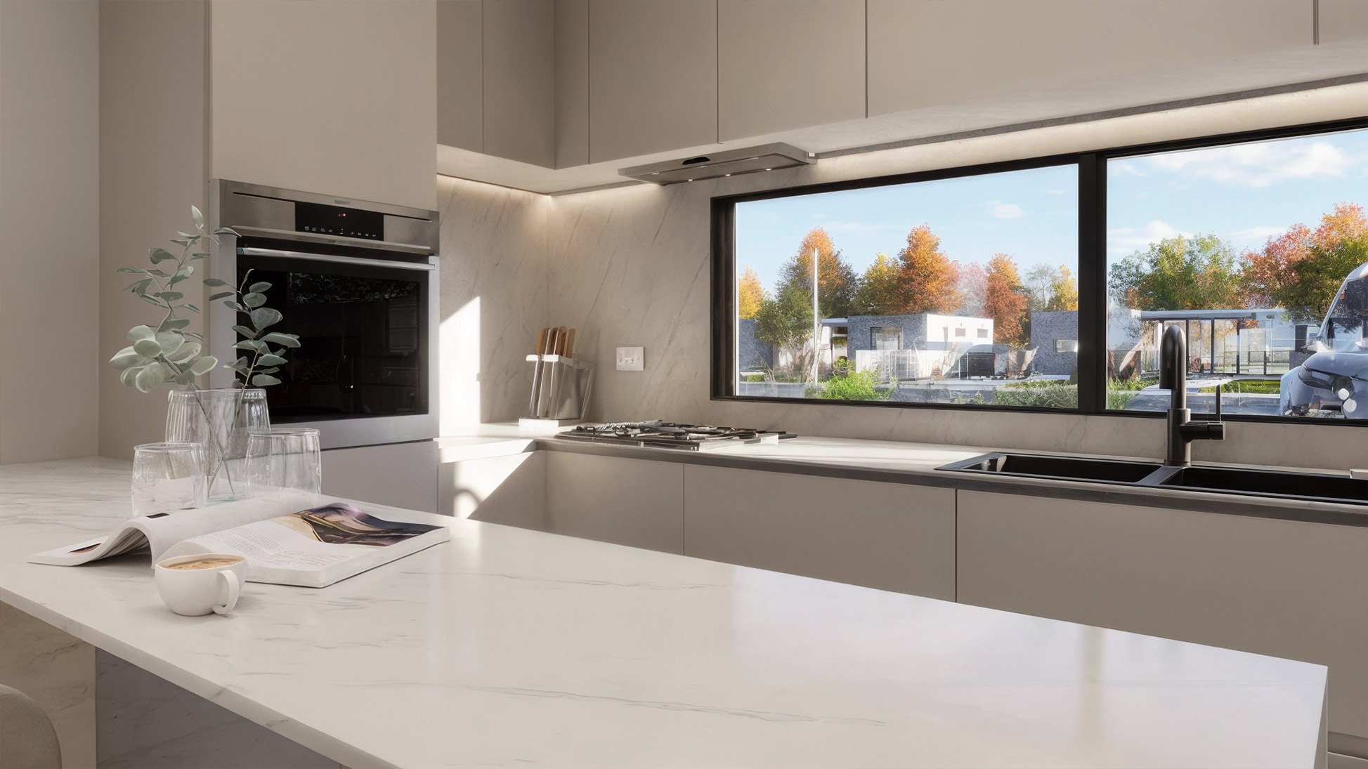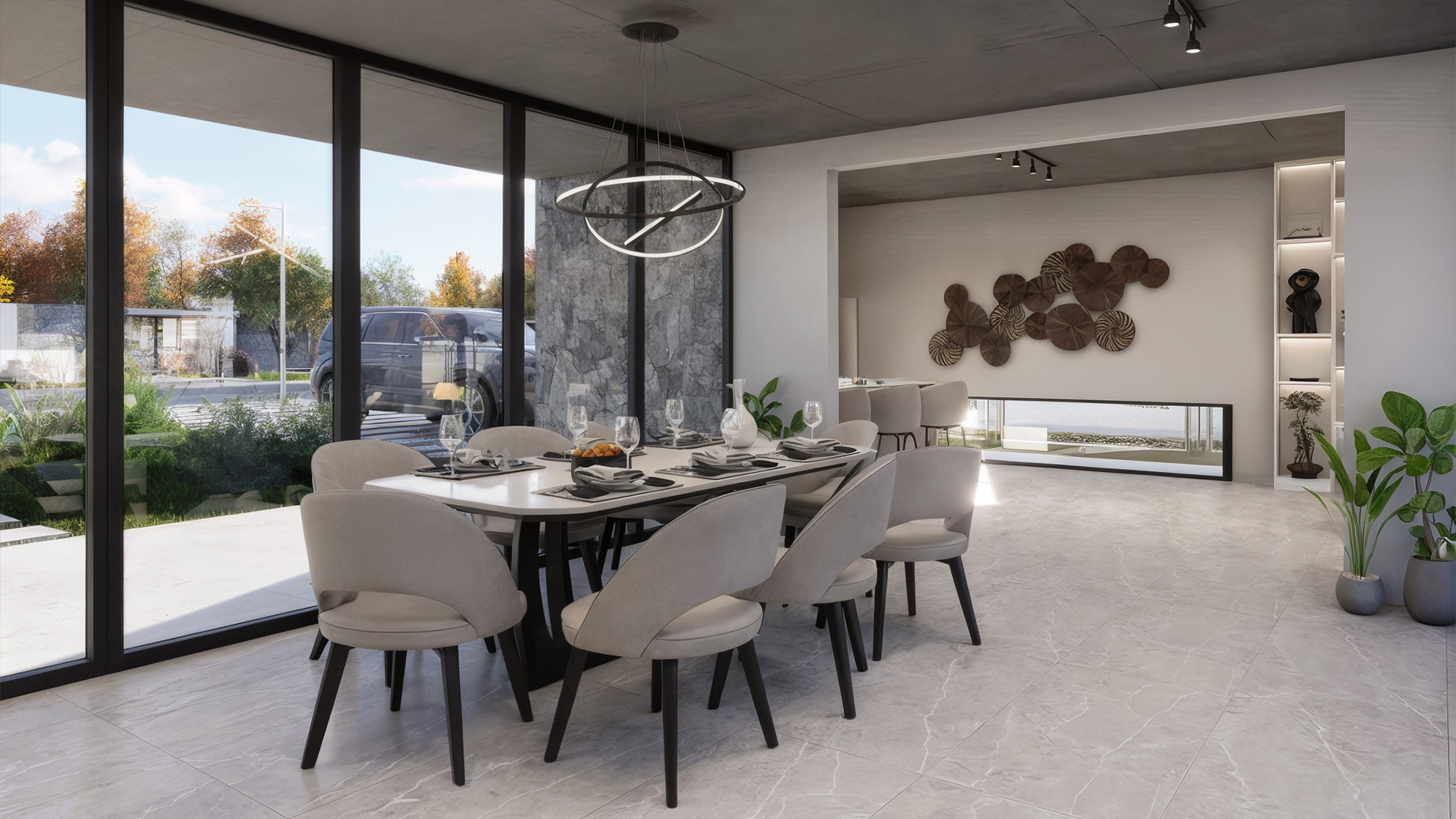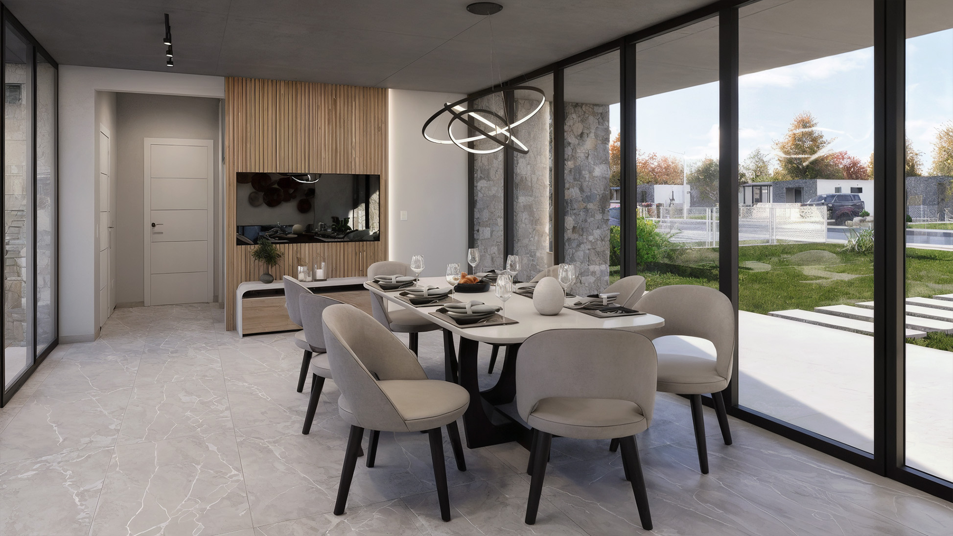 La propuesta combina líneas puras con materiales nobles como madera y piedra natural, priorizando la luz natural, la apertura y la integración con el entorno.