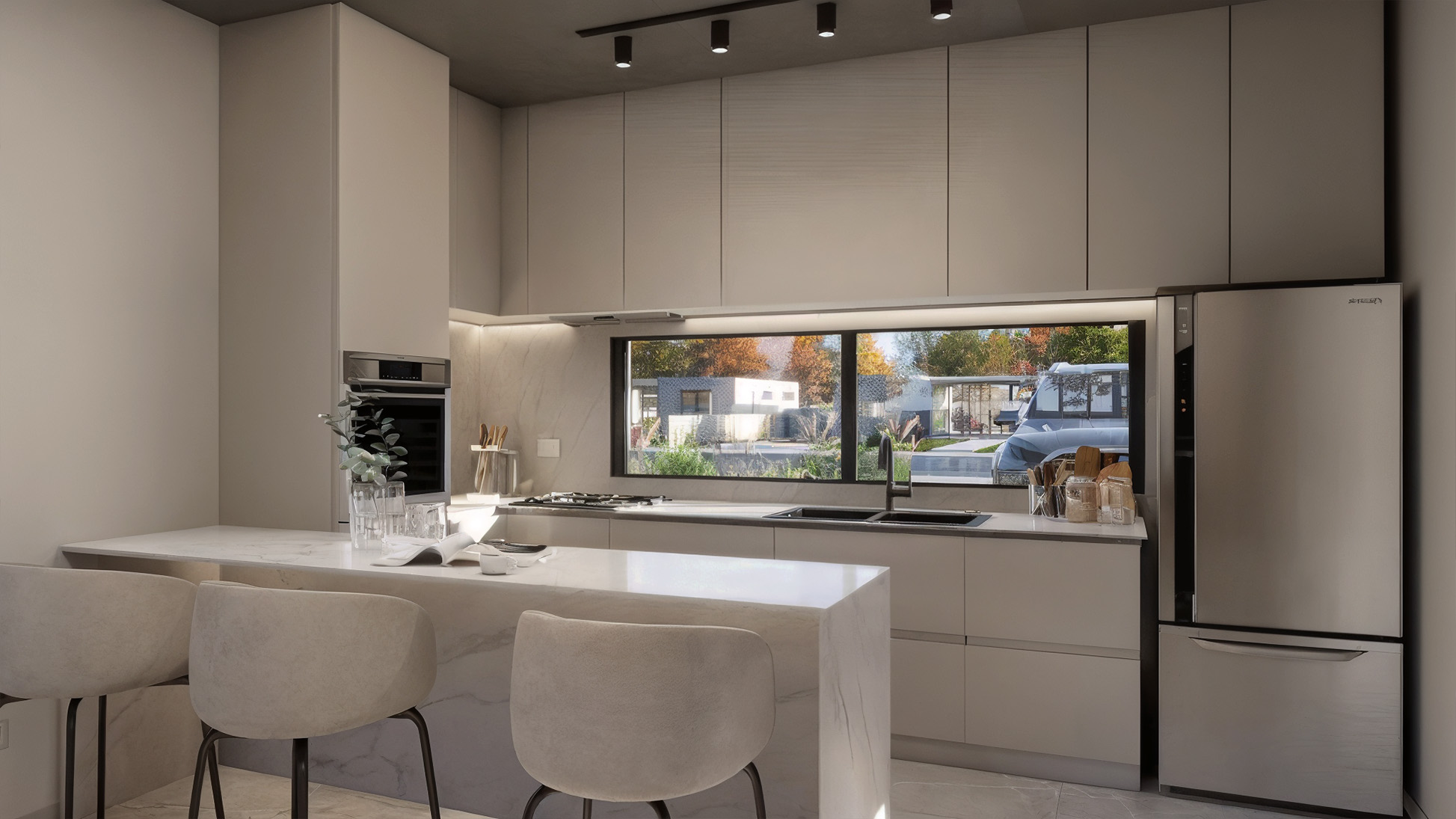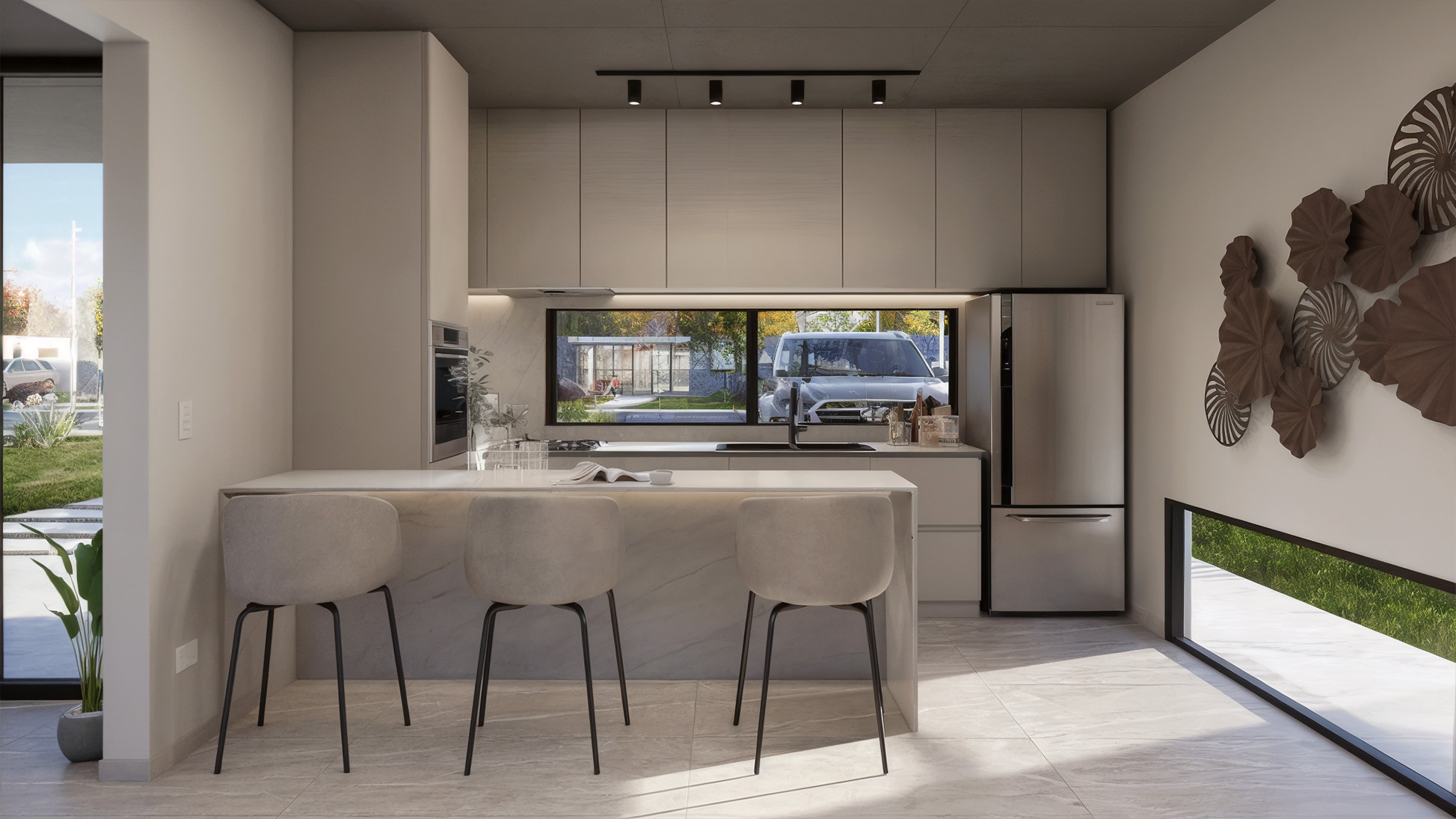 Cada vivienda se organiza con cocina integrada al living y dos dormitorios en suite, ofreciendo funcionalidad, confort y una identidad arquitectónica uniforme y contemporánea.